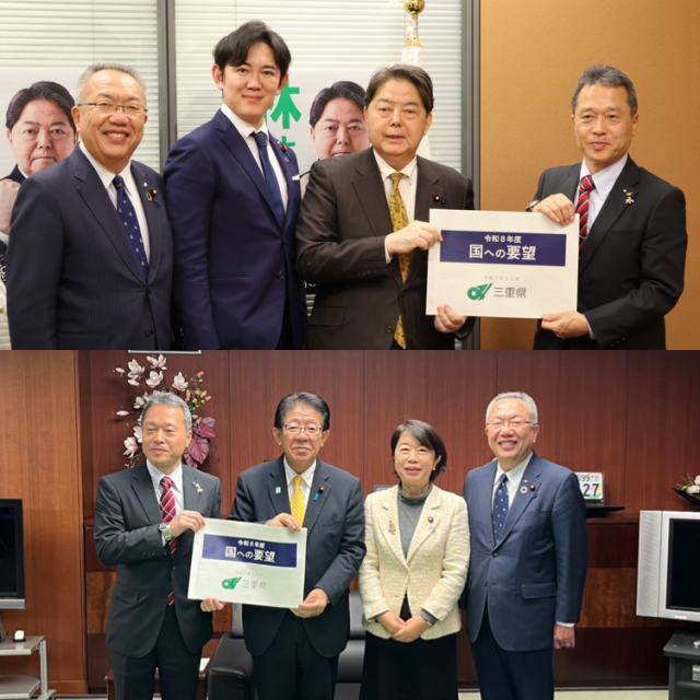 11月20日、一見勝之三重県知事の「令和8年度国への要望活動」に、川崎ひでと衆院議員、山本さち子参院議員とともに同行。林総務大臣へは、公立・公的病院の経営改善に向けた支援や緊急防災・減災事業など地方債の延長などを要望。また金子国交大臣へは、東海環状自動車道、近畿自動車道紀勢線の整備推進や三重県はじめ地方へのインバウンド誘客に向けた支援を要望致しました。また夕刻には、上村南伊勢町長、服部大紀町長、尾上紀北町長等が国道260号の整備推進要望で来館。県民・町民の生活向上に向け、今後も現場の声の課題解決、実現に向け尽力してまいります!